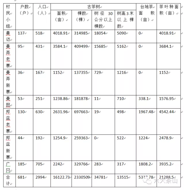 千百年來,人們似乎對(duì)賀開十分熟悉,卻又如此陌生。歷史仿佛為賀開留下一段遺憾。讓我們看一組吸引眼球的古茶樹統(tǒng)計(jì)數(shù)據(jù)吧:曼邁314985棵、曼弄老寨409499、曼弄新寨137355、曼囡181878棵、邦盆老寨697663棵、邦盆新寨259363棵、廣岡329766棵,合計(jì)2330509棵。